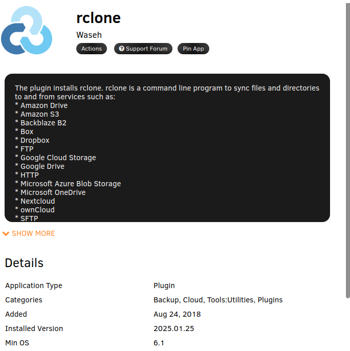 You want this to be installed directly on the Unraid OS level, not within a separate Docker. For this, install the rclone from Waseh, which will put the rclone