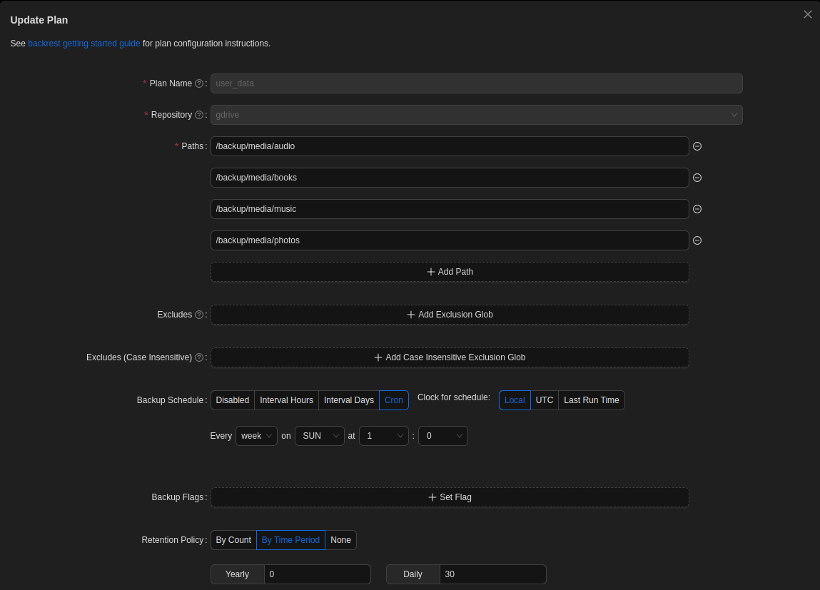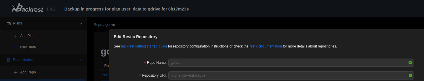 Once Backrest is running in the Docker container, we need to add a restic repository that is backed by the configured Google Drive (via rclone):