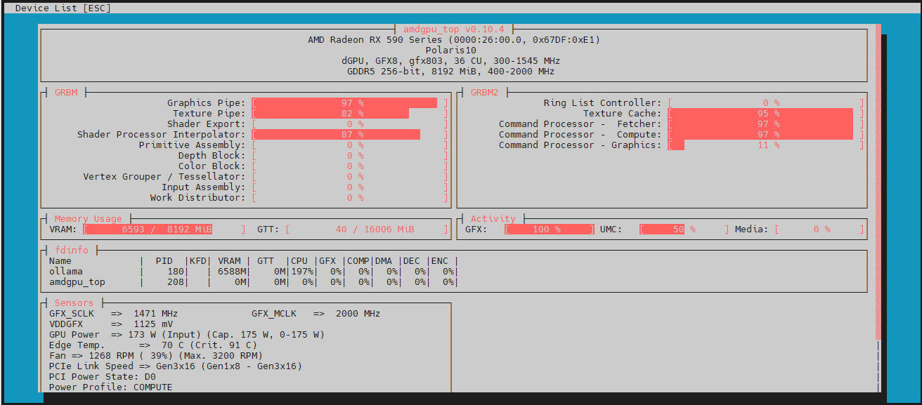 Then in another shell, I monitored the GPU usage with amdgpu_top, ensuring the old card was working as hard as it could:
