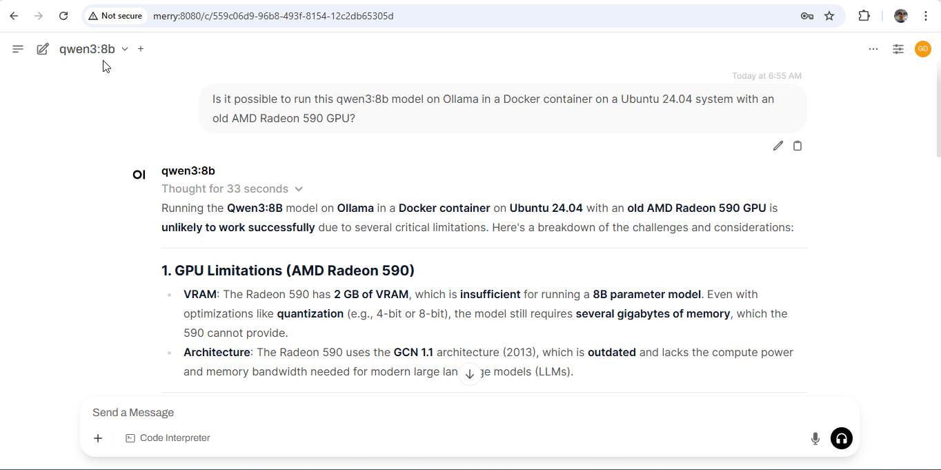 Finally, I browsed to the Ollama webui and asked the Qwen model if it thought I could run it on such an old AMD GPU. Quite rightly, Qwen advised me that it is highly unlikely it could run on such ancient hardware:
