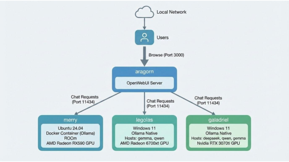 With multiple systems on my home network hosting Ollama and different models now, I decided to put a single instance of OpenWebUI on the home server running 24/7 in the basement. This lets family members use local LLMs from anywhere on our home network, useful for comparisons against the public models like Gemini and ChatGPT.