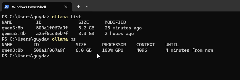 Monitoring the GPU usage via Task Manager, I was able to run queries against both Qwen and Gemma, though that is a bit too tight:
