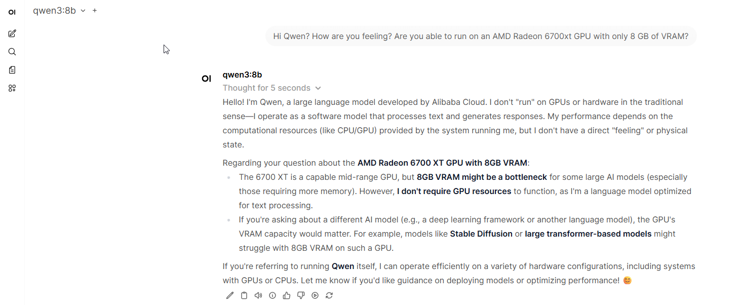 Then browse to http://localhost:3000 to access OpenWebUI, where I tested the recent Qwen v3 model:
