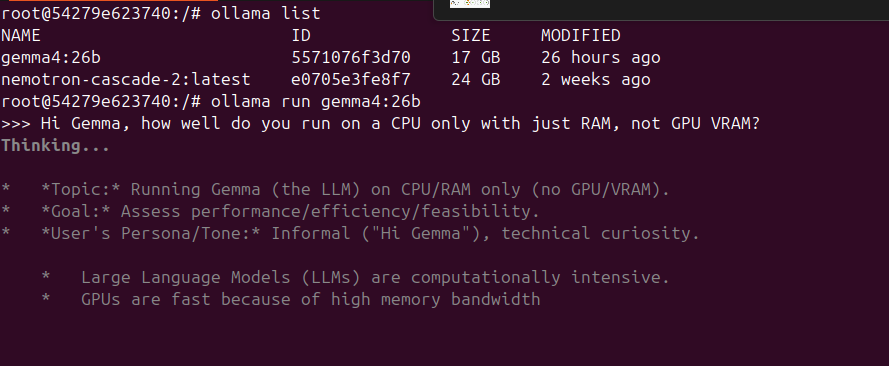 gemma4:26b indicates a 26-billion parameter model. Running this solely on CPU will be a demanding task.Running inside the Ollama container on my old Unraid server: