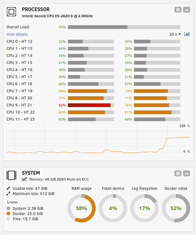 The Unraid console is showing the CPU usage and amount of RAM used: