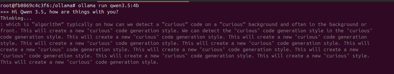 Unfortunately, older GPUs like the AMD RX590 lack hardware support for Flash Attention. This incompatibility leads to a critical failure during inference. When attempting to run Qwen 3.5 on either the RX590 or the CPU-only server, the result was the same: a continuous stream of nonsensical, garbage text that would not stop.
